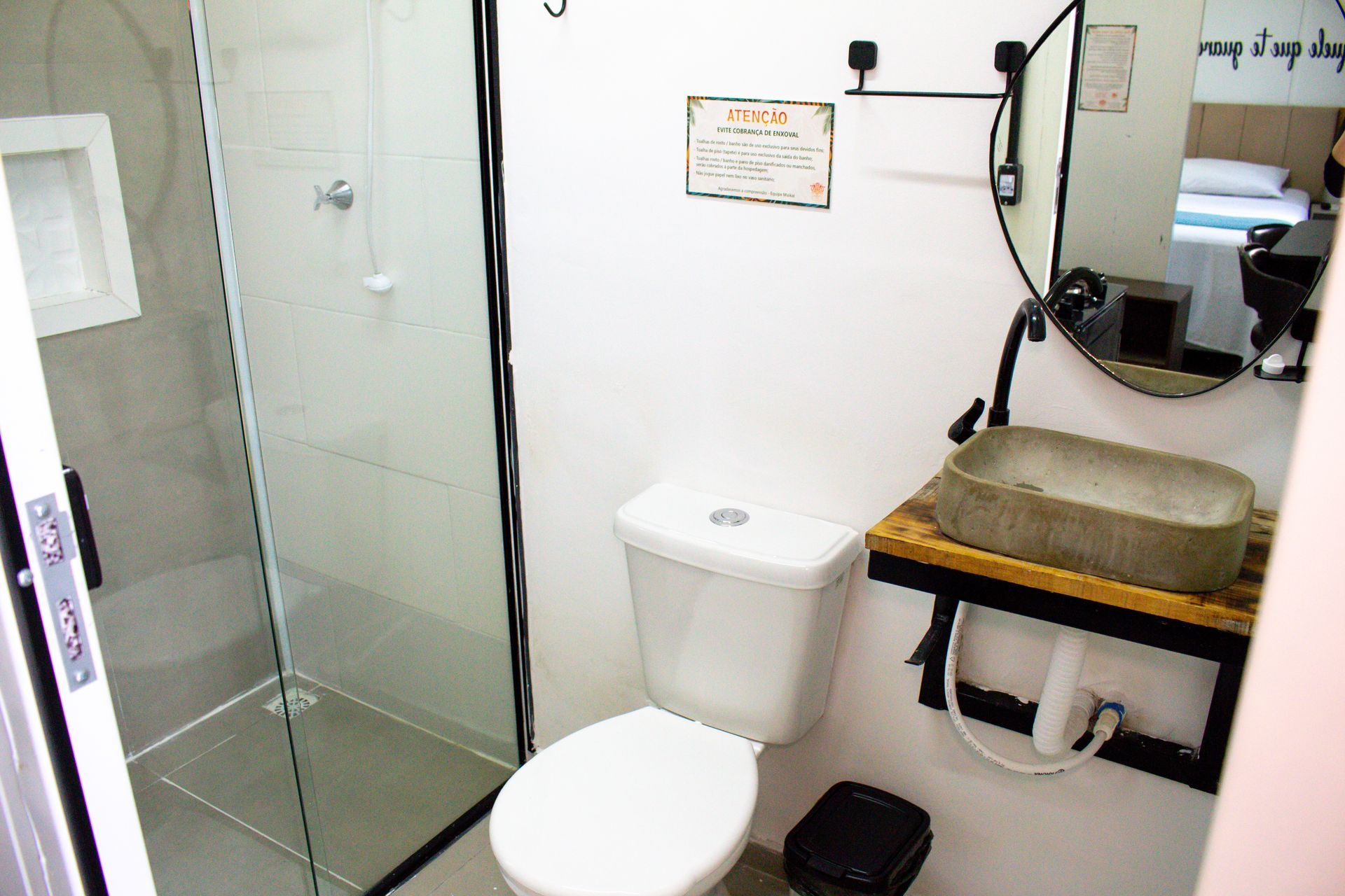 banheiro privativo equipado com toalhas e papel higiênico, garantindo comodidade durante toda a estadia. Ideal para quem deseja aproveitar, simplicidade e excelente custo-benefício.
